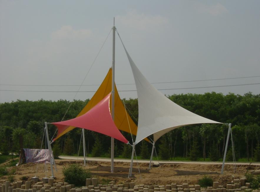 膜結構所用膜材料由基布和涂層兩部分組成.基布主要采用聚酯纖維和玻璃纖維材料;涂層材料主要聚氯乙烯和聚四 氟乙烯。常用膜材為聚酯纖維覆聚氯乙烯(PVC)和玻璃纖維覆聚聚四氟乙烯(Teflon)。PVC材料的主要特點是強度低、彈性大、易老化、徐變大、自 潔性差,但價格便宜,容易加工制作,色彩豐富,抗折疊性能好。為改善其性能,可在其表面涂一層聚四氟乙烯涂層,提高其抗老化和自潔能力,其壽命可達到15 年左右。Teflon材料強度高、彈性模量大、自潔、耐久耐火等性能好,但它價格較貴,不易折疊,對裁剪制作精度要求較高,壽命一般在30年以上,適用于 永久建筑。
