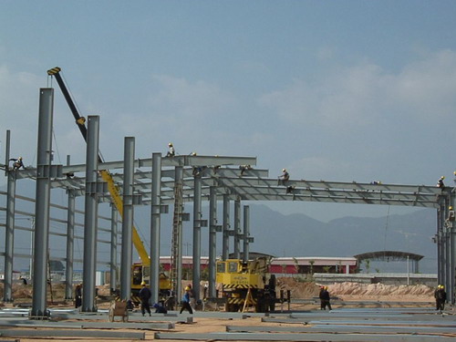 7 如果跨間較長,也可以從中間開始安裝兩榀剛架 → 柱,柱間梁 → 屋面斜梁 → 支撐 → 檁條順序安裝,使兩榀剛架與中隔墻連成整體,形成穩定的空間體系,再向兩端延伸。